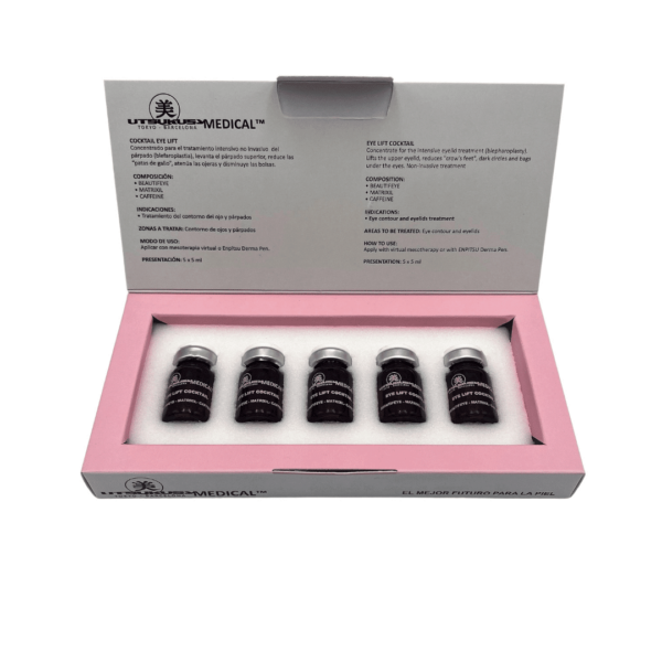 Augen Lifting Serum für eine professionelle Microneedling Behandlung (Dermapen) und Mesotherapie (Dermaroller). Eine Ampulle enthält 5 ml Serum – dies sollte für 3 bis 5 Anwendungen reichen. Ebenfalls erhalten sie pro Ampulle eine Spritze und eine Nadel zur sterilen Entnahme des Serums.